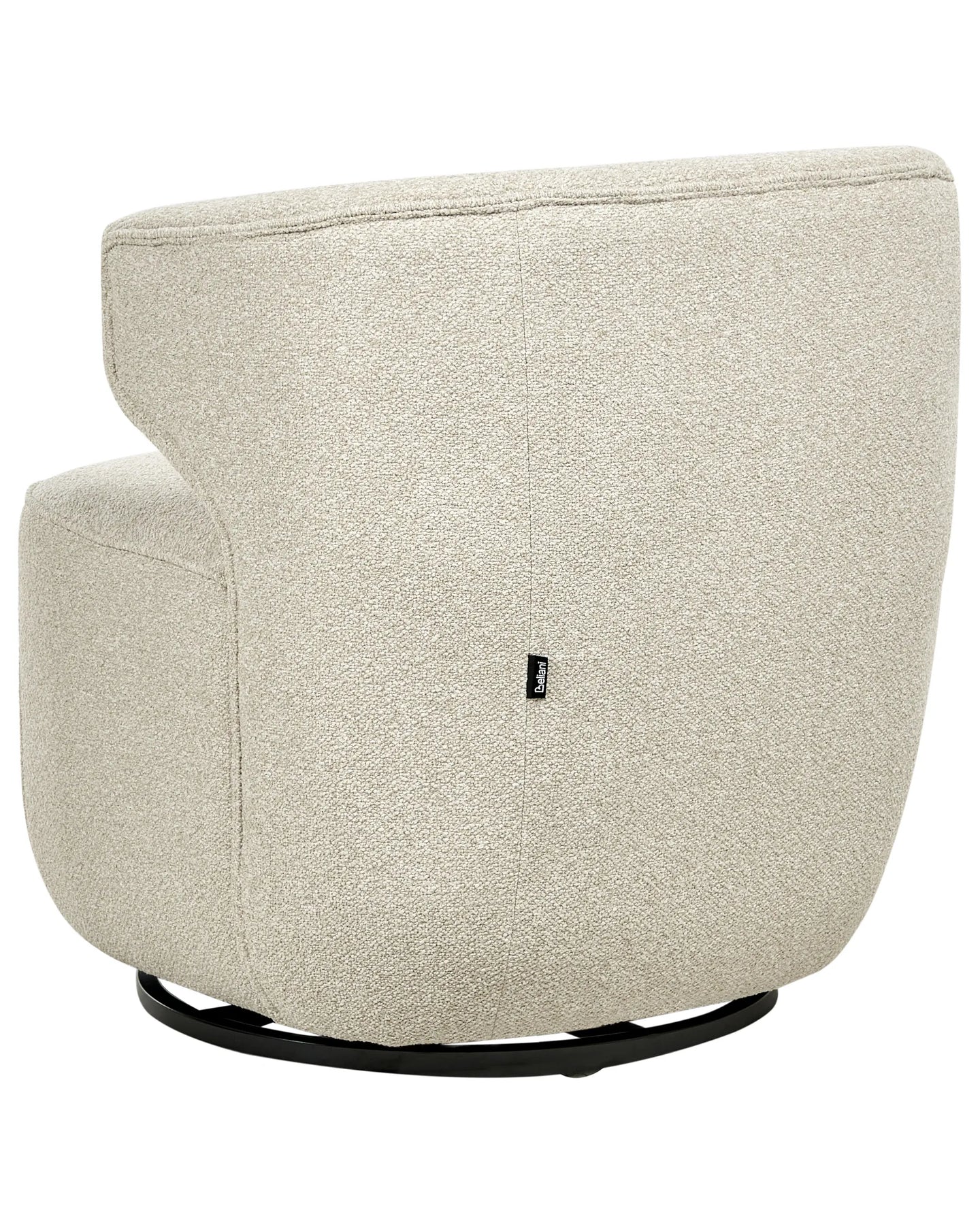 This lounge chair is a functional and stylish addition to any interior. Featuring a swivel base, it allows for effortless rotation without having to move the chair. The soft bouclé upholstery in a light beige shade brings a cosy and inviting feel, while the rounded shape and low backrest enhance comfort. The black metal base adds stability and a sleek contrast. Its shape and finish bring an industrial yet cosy touch to any interior.