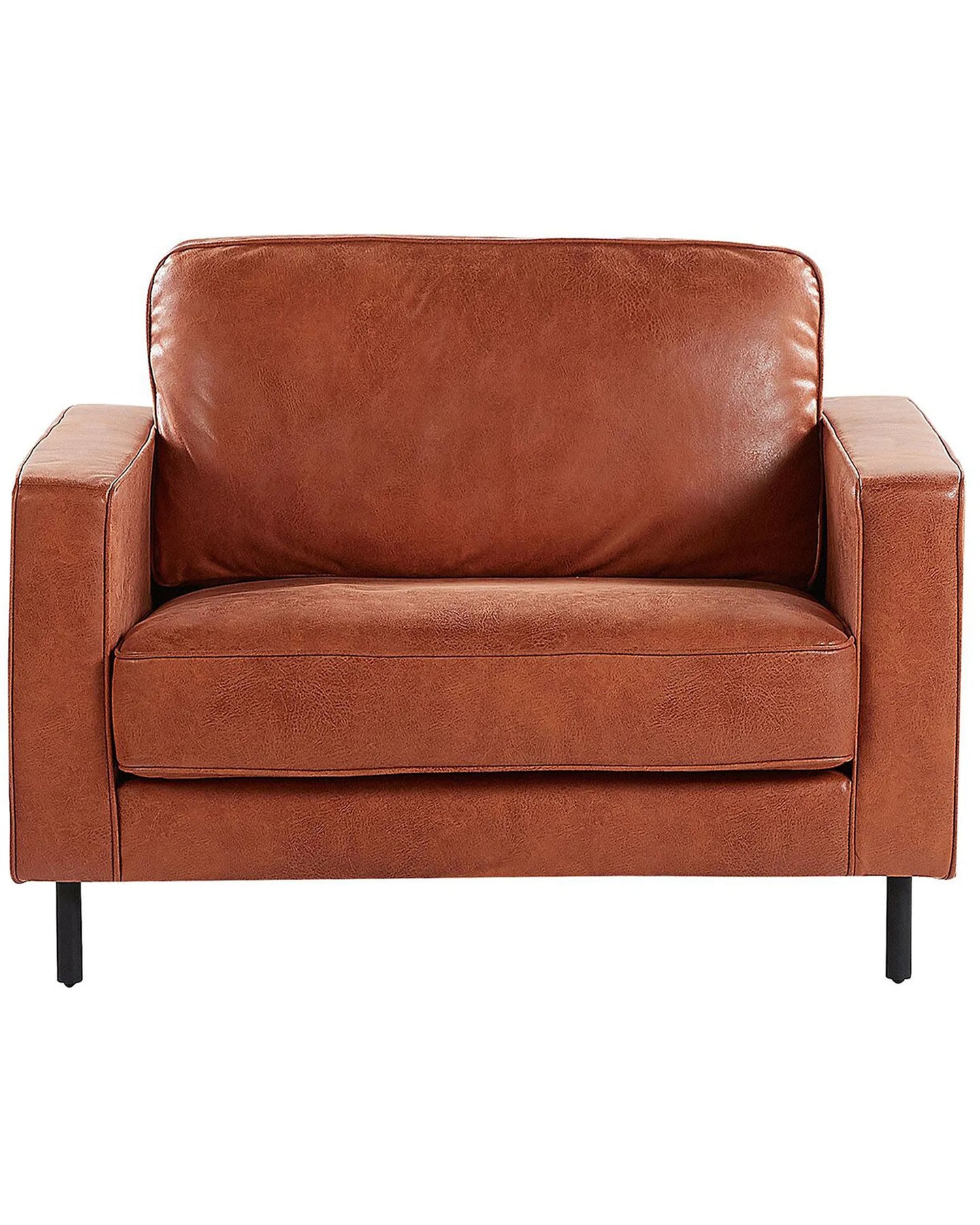This armchair makes an ideal key element of any living area, elevating the room decor with its timeless design. The clean-lined silhouette on metal legs, tailored in golden brown, leather-like fabric, has an elegant, minimalist appearance. The upholstery is pleasant to touch, and the seat cushions are generously filled for the best sitting comfort. Perfect for adding a luxury feel to a traditional as well as a modern interior.