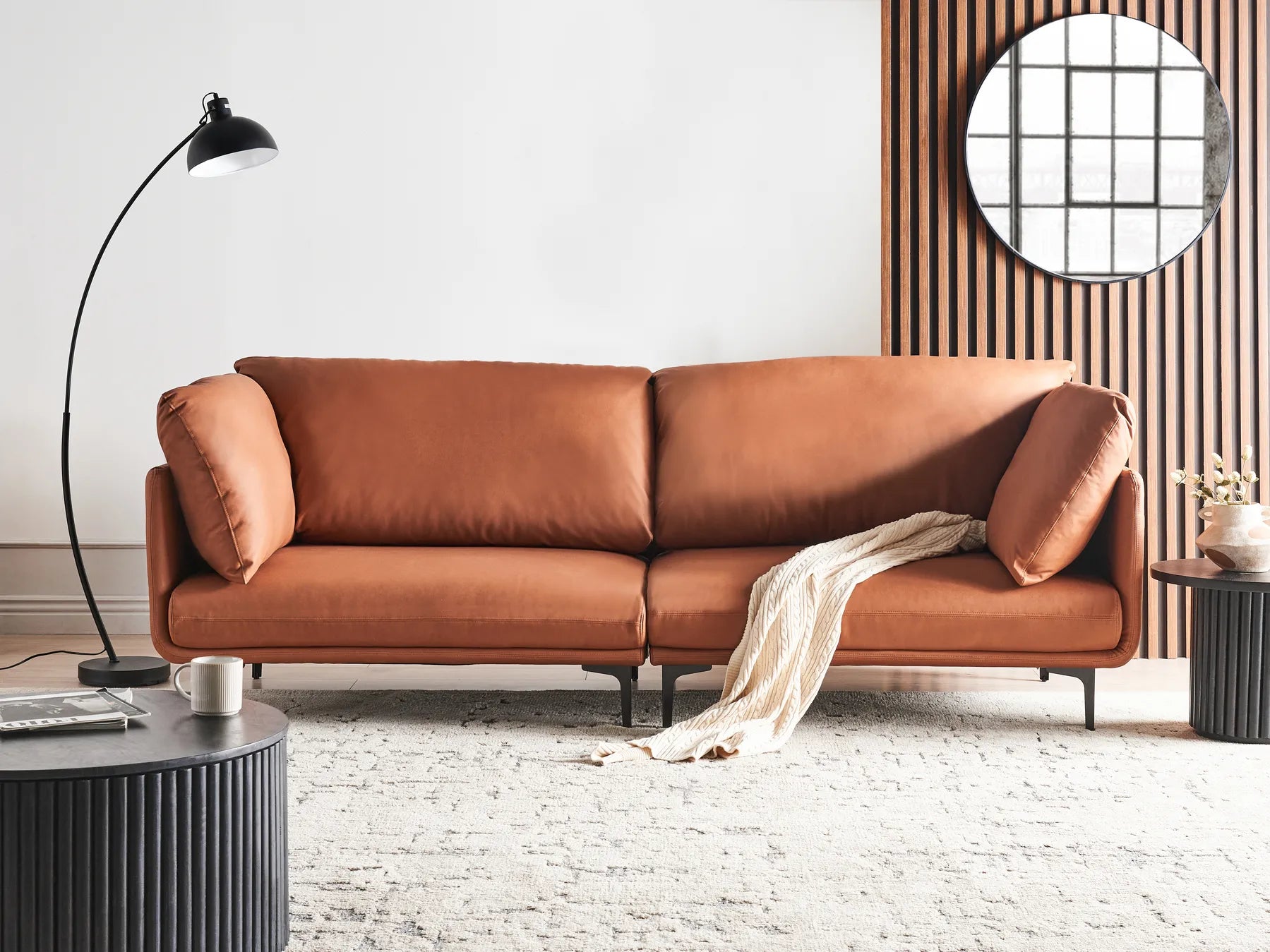 Elevate your living space with this sleek and elegant sofa, designed to be the perfect centrepiece for interiors inspired by modern or industrial style. Upholstered in durable, low-maintenance vegan leather, it offers comfortable seating for three people and the sturdy metal legs provide stability while adding a stylish touch. The additional small cushions guarantee extra support for a truly relaxing experience.