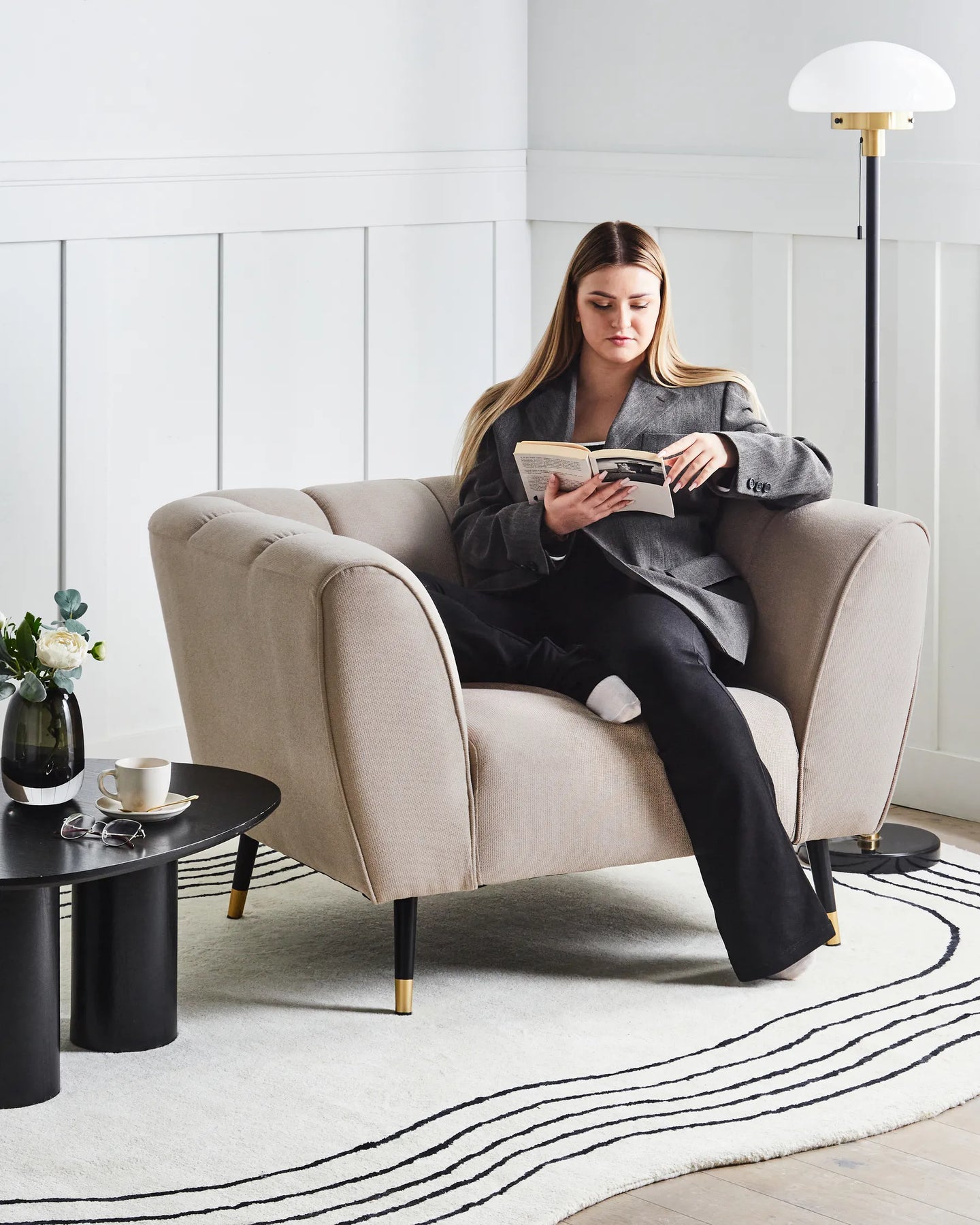 Add a touch of luxury to your space with this stylish armchair, designed for comfort. The low backrest, thickly padded seat, and generous width and depth make it an ideal spot to relax and unwind. Supported by sleek metal legs with refined gold detailing, this chair effortlessly blends sophistication with practicality, becoming a standout feature in any room.