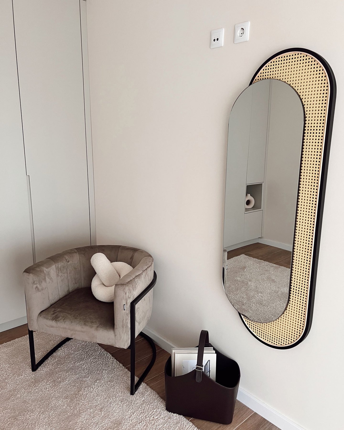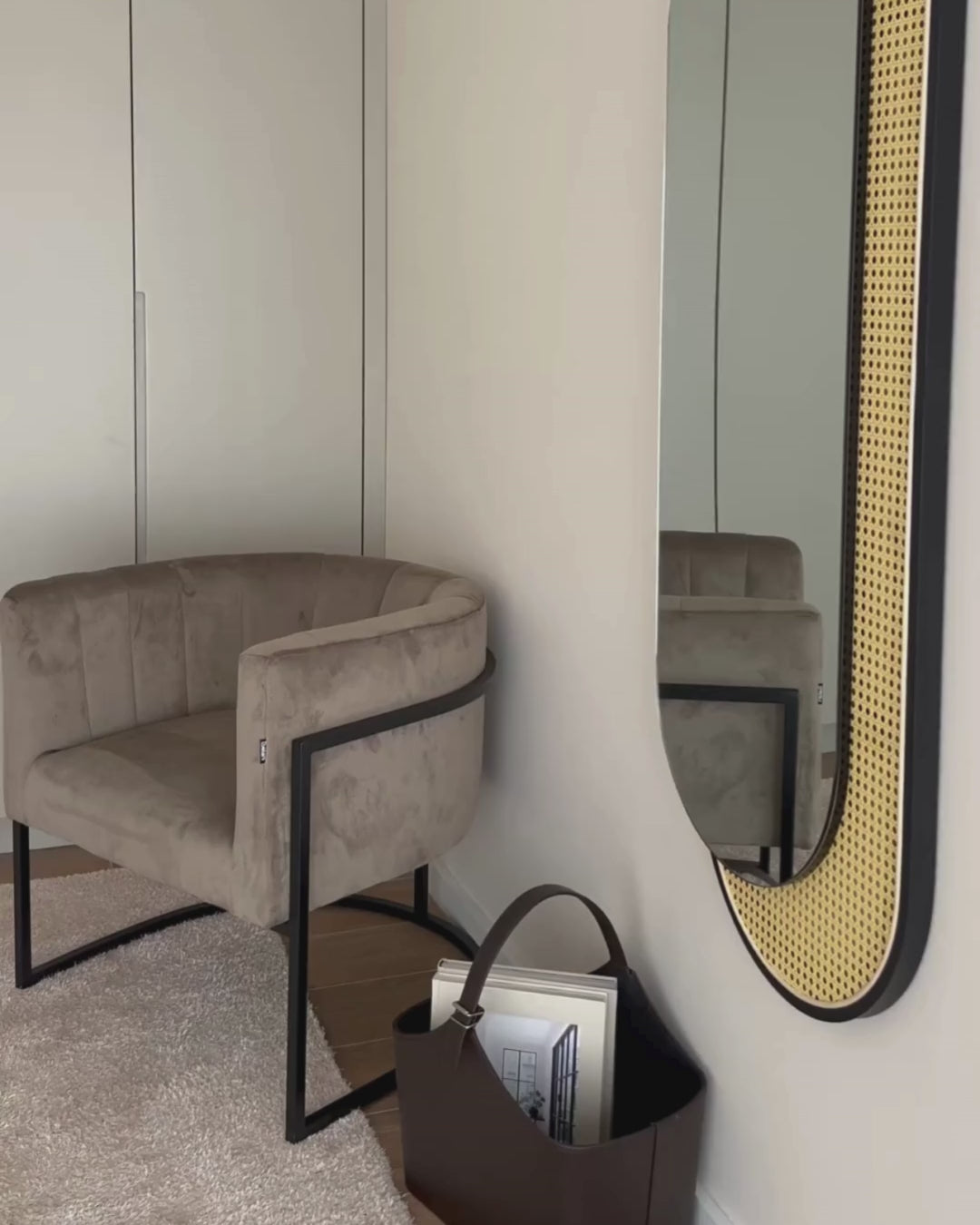 Beige armchair with black metal frame in a modern interior setting