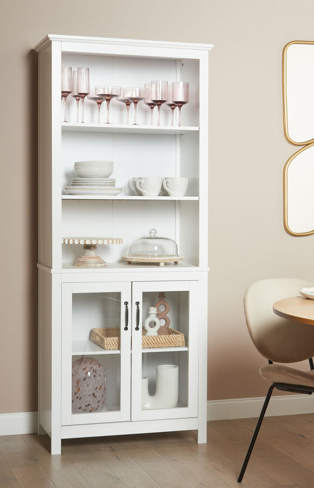 In hallways, a slim display cabinet adds structure and storage while keeping the entrance feeling open. In dining rooms, it works well for glassware, tableware and serving pieces, keeping entertaining essentials organised. In living rooms, a narrow glass-front unit is ideal for books and décor, especially when you want a curated look without bulky furniture.