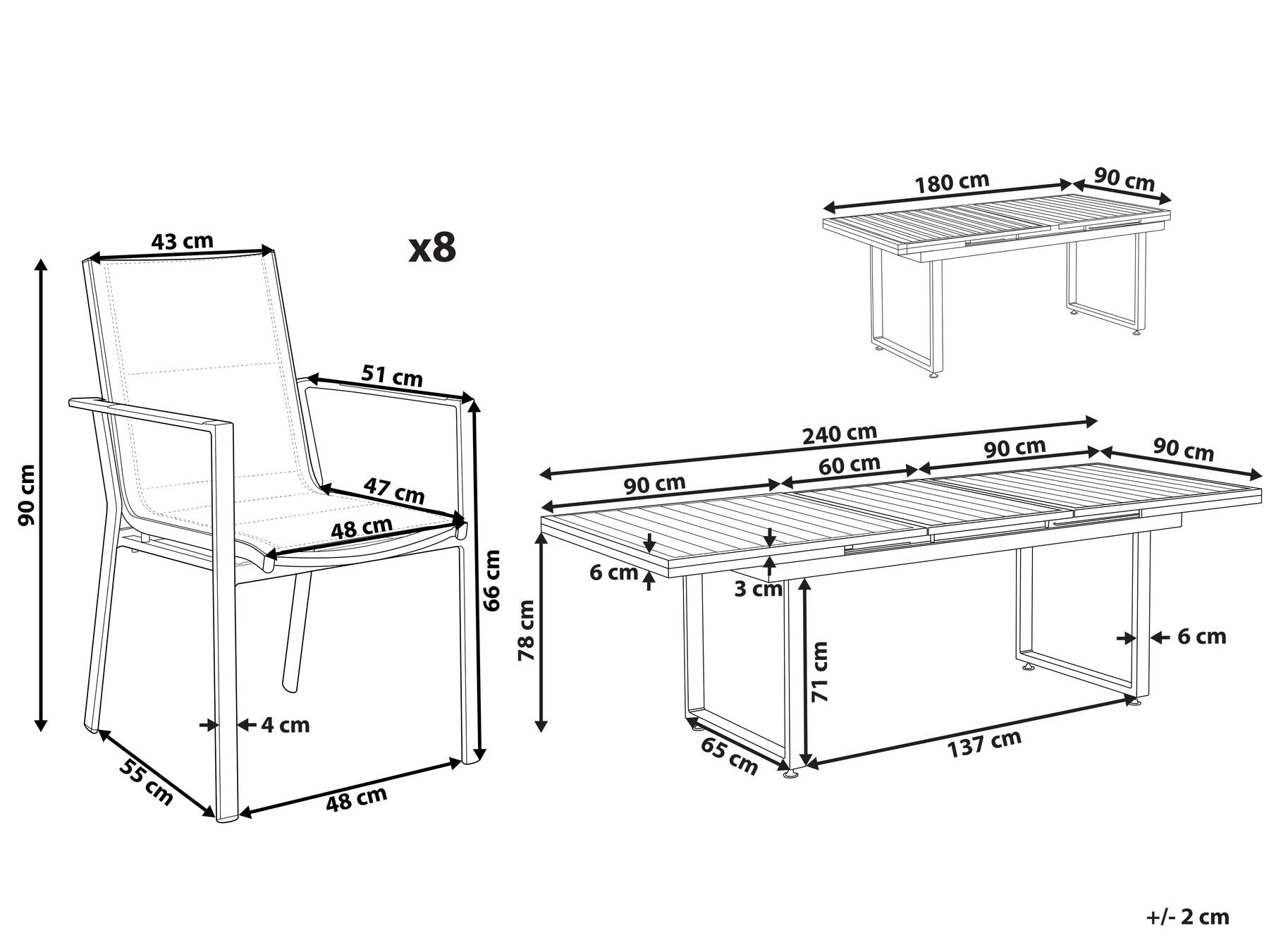 Prepare your garden for family and friends gatherings with this garden set. It consists of an extending table that can seat up to 8 people and chairs upholstered in grey fabric. The construction is made of aluminium thanks to which the set can be used outside without worry it gets damaged. The chairs with grey upholstery complement the elegant yet minimalist design of the table. The furniture will match perfectly bigger outdoor areas, bringing in a modern accent.