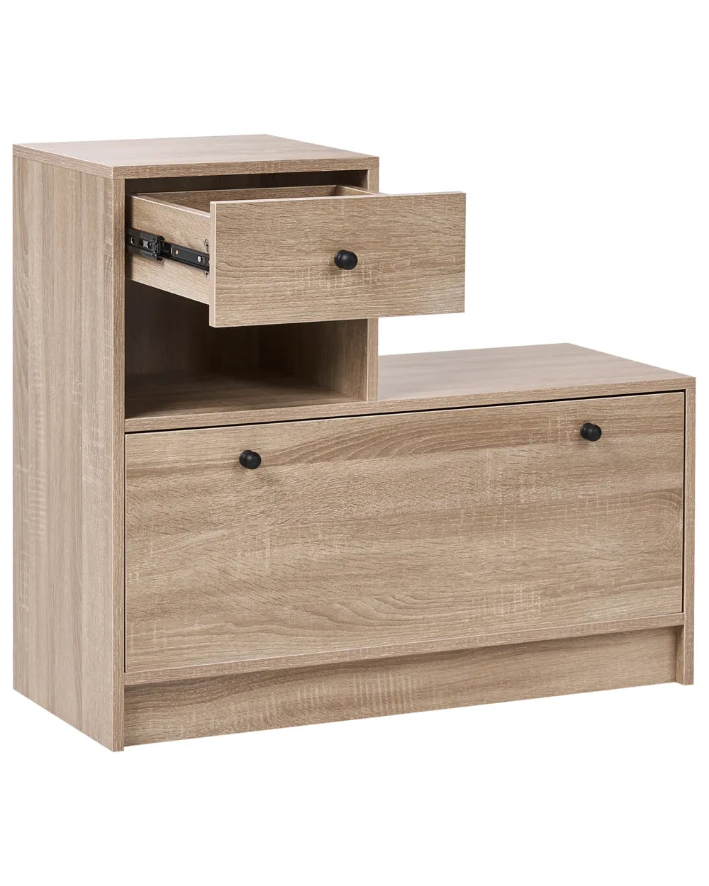 This stylish, space-saving hallway unit in a wood-effect finish is the perfect way to keep your entrance tidy and organised. It includes a practical cabinet with a tilt-out shoe cupboard and a handy drawer for keys and other small items, complemented by a matching wall panel with coat hooks and a mirror. Ideal for any modern home, this versatile hallway set helps you keep clutter at bay while adding a contemporary touch to your décor.
