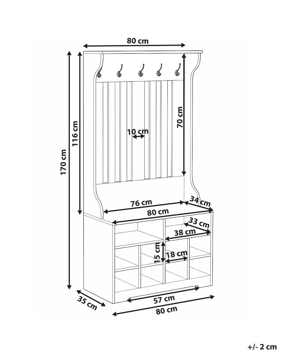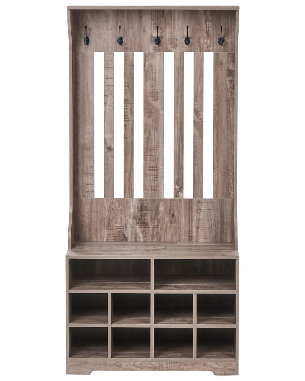 This elegant hallway unit in a warm wood-effect finish is the perfect way to keep your entrance organised and welcoming. It features a practical cabinet with multiple cubbies for shoes and everyday essentials, while the upper panel comes with sturdy hooks for coats, bags, or scarves. The vertical slats and simple design give it a rustic yet cosy feel, making it ideal for modern homes.