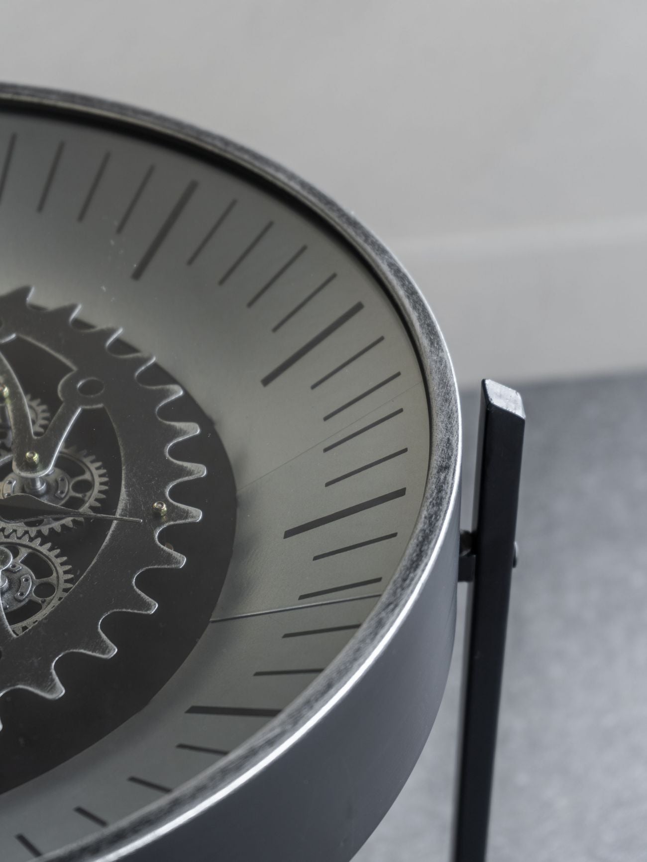 Designed with a round glass top and an integrated clock face, this distinctive table features a visible moving mechanism that brings character and interest to your space. Practical as well as decorative, it functions as both a clock and a stylish side table.