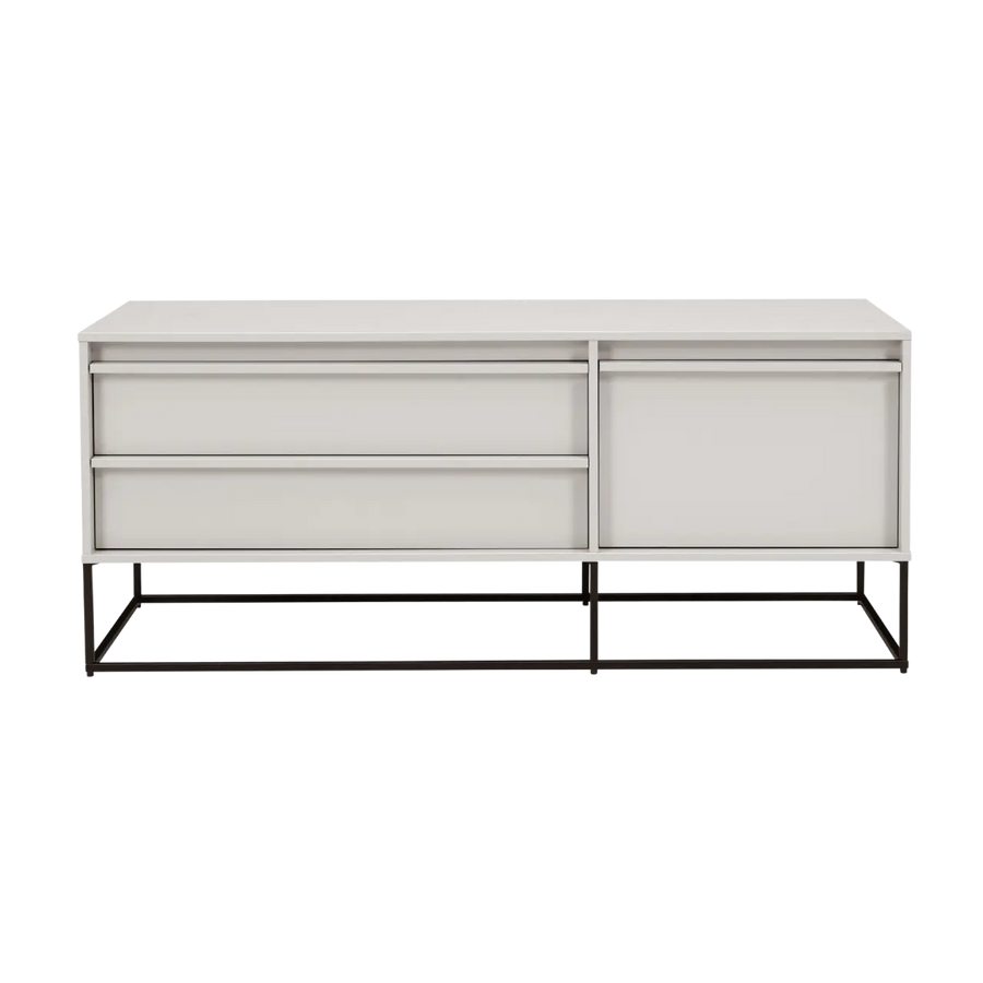White dresser with black metal legs on a white background