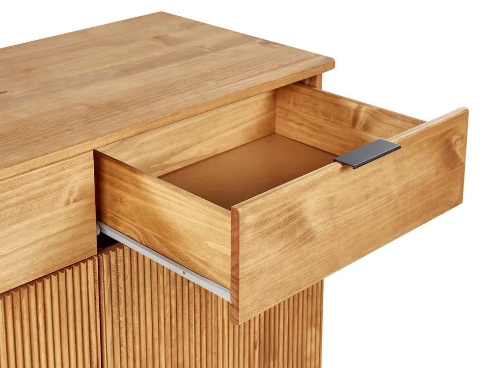 This rustic sideboard, crafted from light pine wood, brings a natural charm to any room. Its ribbed door fronts add texture, while the spacious drawers provide plenty of storage for your essentials. The simple yet stylish design, paired with its sturdy black legs, makes it perfect for bedrooms or living areas, adding warmth and character to your place.