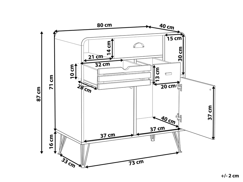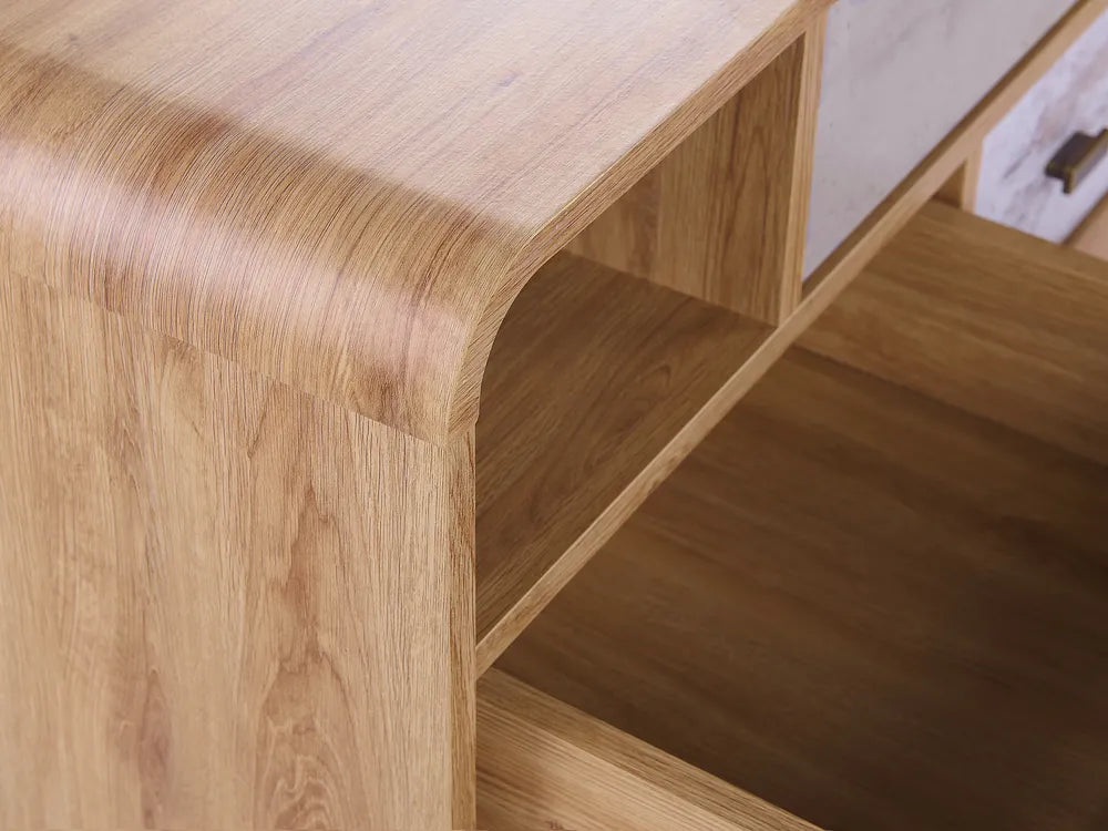 This sideboard inspired by the 60s and 70s furniture trends fits seamlessly within any modern interior design scheme. The body with rounded edges is finished in oak wood effect laminate and placed on metal hairpin legs. The cabinet works great in any bedroom, living area or hallway. Closed storage and three, seemingly misplaced drawers bring retro charm to any room.