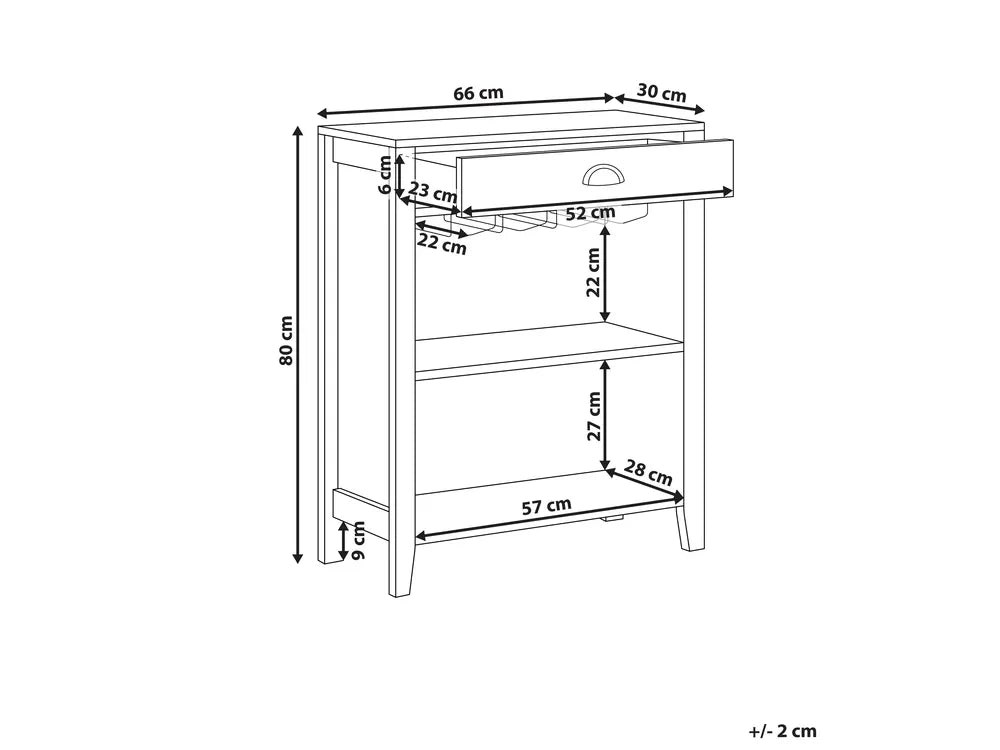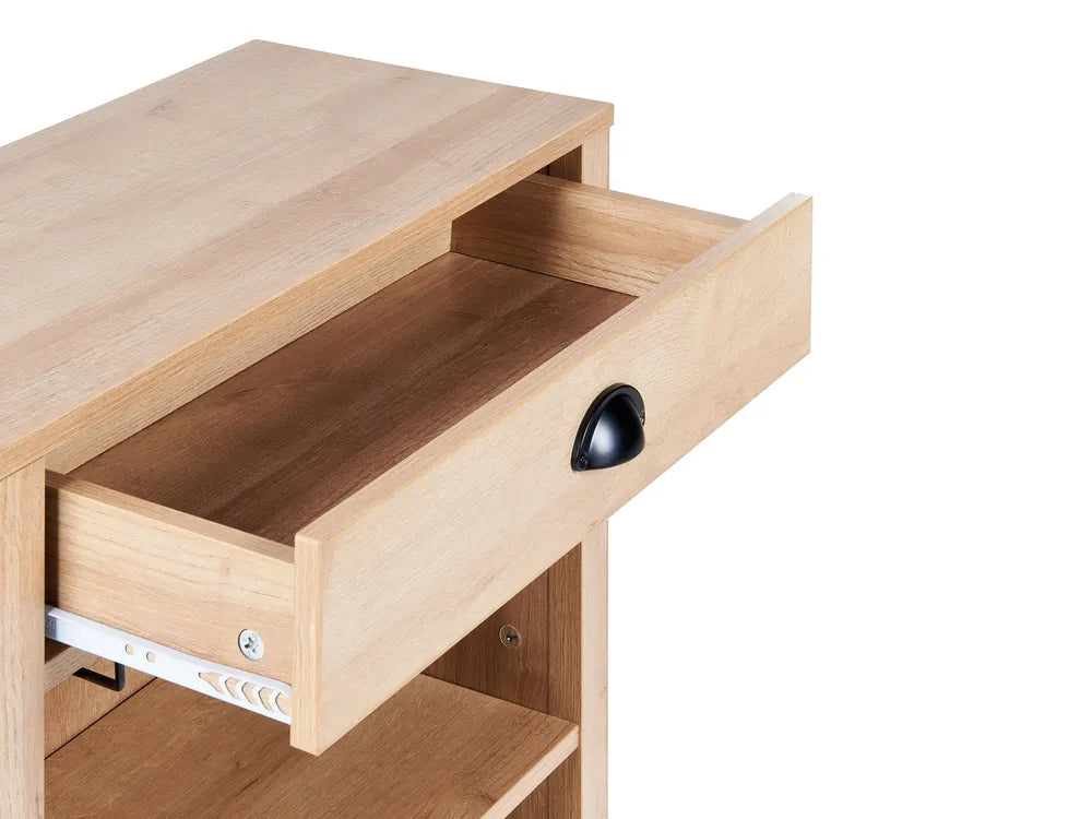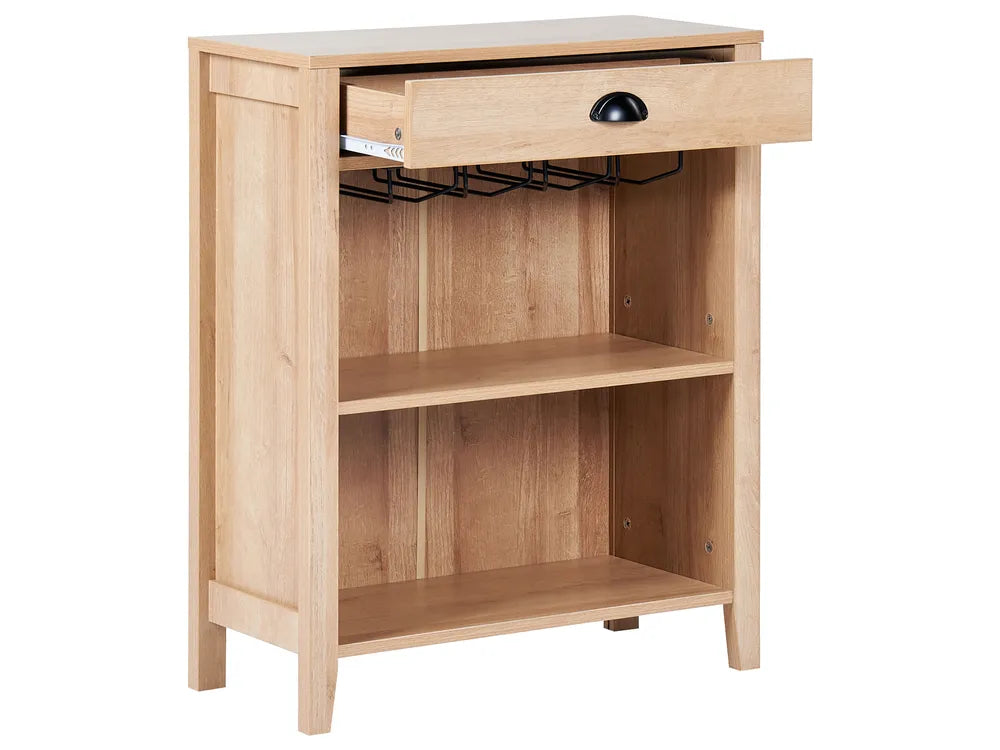 This elegant sideboard combines practicality with traditional charm. It features two open shelves, one equipped with glass holders for convenient storage, and a handy drawer for smaller essentials. Made from particle board with a light wood-look finish, it captures the warmth of natural wood while offering durability. Its timeless design makes it a sophisticated addition to any space.