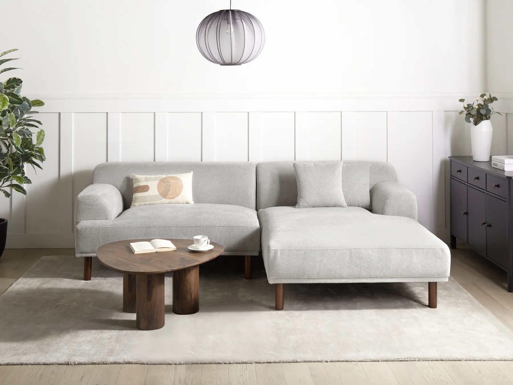 This modern corner sofa features a sleek, low-profile design with plush upholstered seats, offering both comfort and style for any home. Its water-repellent fabric ensures long-lasting durability and is pet-friendly for easy maintenance. Supported by sturdy wooden legs, its simple elegance complements any living room perfectly. Combining practicality with contemporary charm, it makes an ideal centrepiece for your living space.