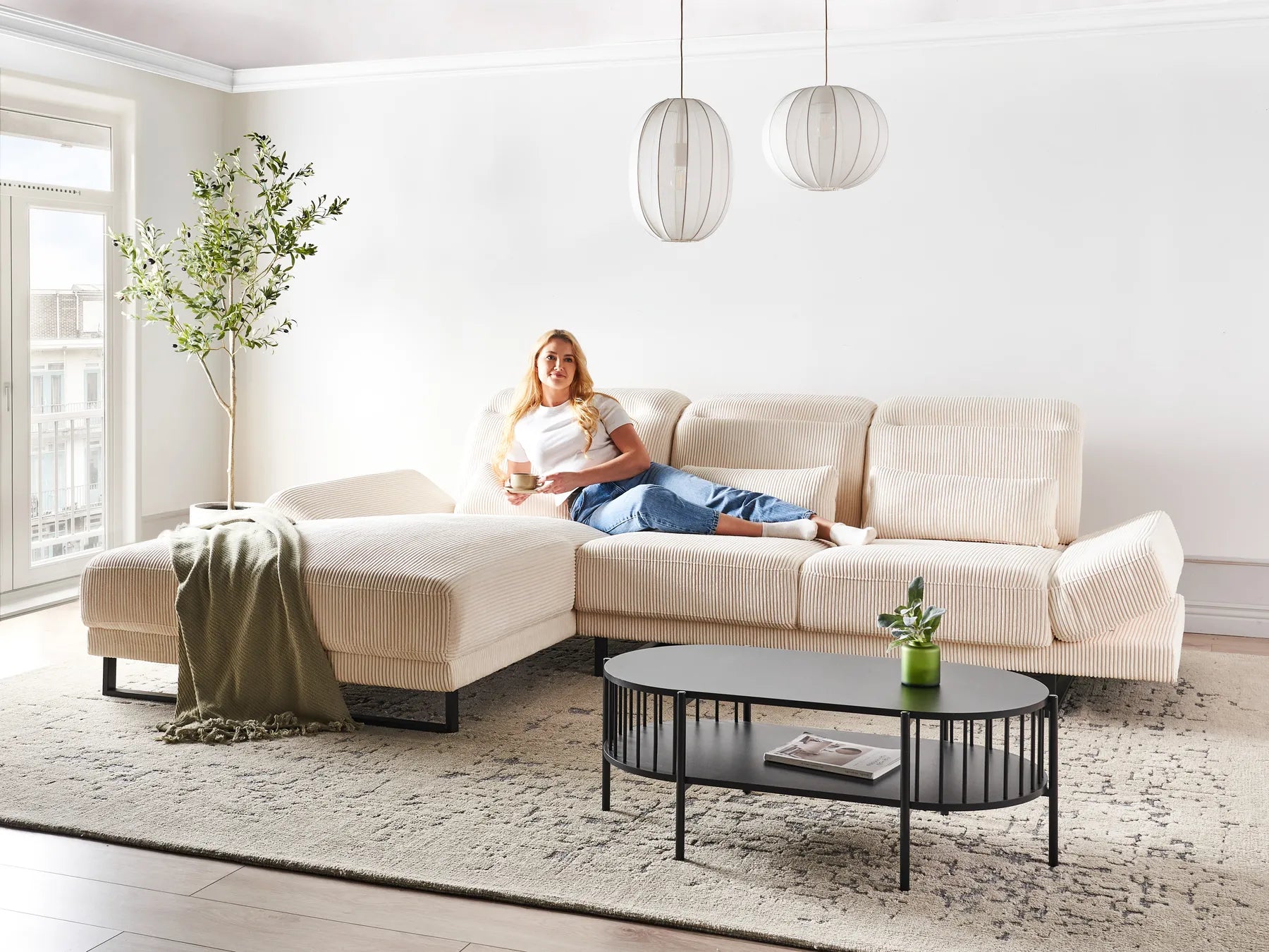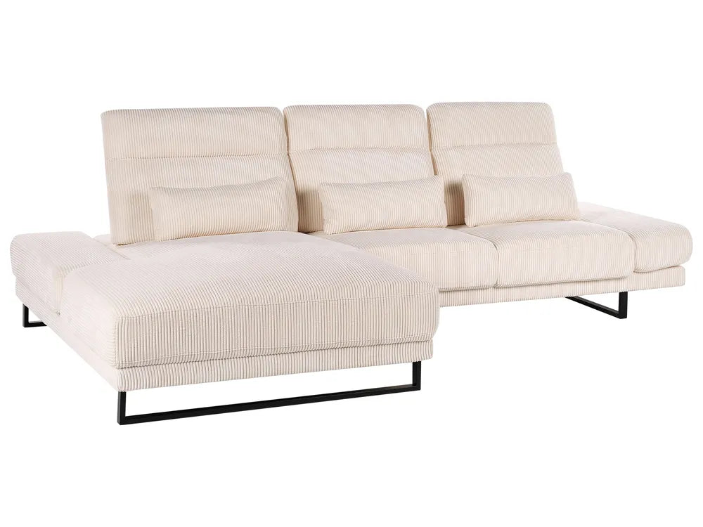 Elevate your living space with this sleek corner sofa, designed for both style and comfort. Its sliding backrests let you tailor the seat depth, while the movable headrest and adaptable armrests ensure optimal relaxation. The sofa is upholstered in a soft corduroy fabric, ensuring durability. Strong steel legs provide reliable stability, and the sofa's toned beige colour ensures it fits seamlessly into various interior designs.