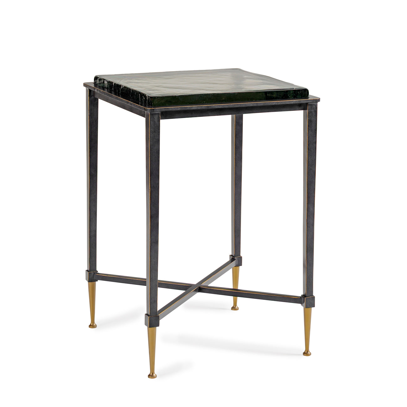 The Stella Square Glass Top Side Table combines modern elegance with refined craftsmanship. Its sturdy iron frame, finished in brushed satin with gilded accents, supports a striking 18 mm textured brick glass top that catches and reflects the light with subtle depth. Intricate detailing within each glass slab ensures every piece is unique.