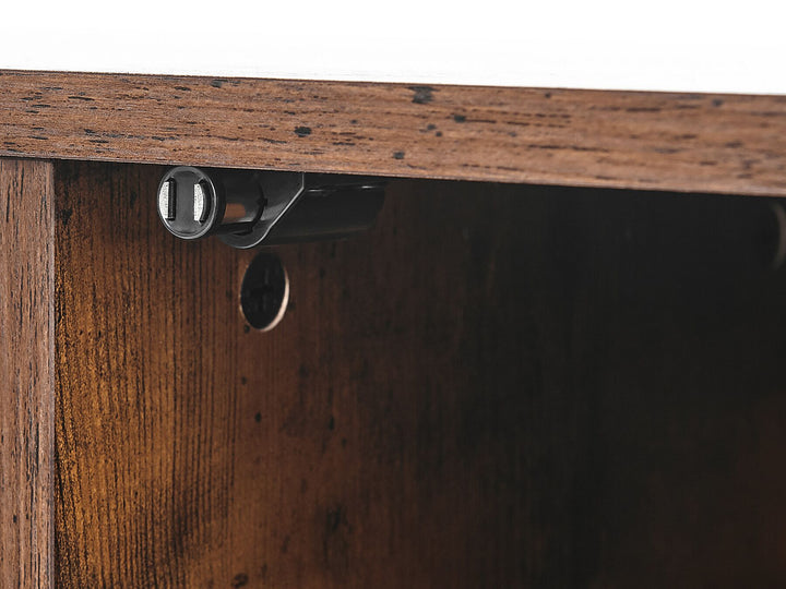 Store your documents, magazines and trinkets, and set a television in one furniture piece. This low TV stand of dark wood effect and a black powder-coated frame boasts an industrial style, matching every modern living room. The doors feature a slatted front, allowing decorative items to show through them. The shelves can serve as an additional place for books or ornaments.