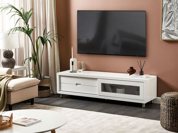 Introduce modern design to your living area with this low TV stand. With its high gloss white finish, it offers stylish look as well as high functionality. The piece features two drawers and a cabinet with a sliding door. There is a grommet on the back so that you can easily connect electronic devices to your TV.