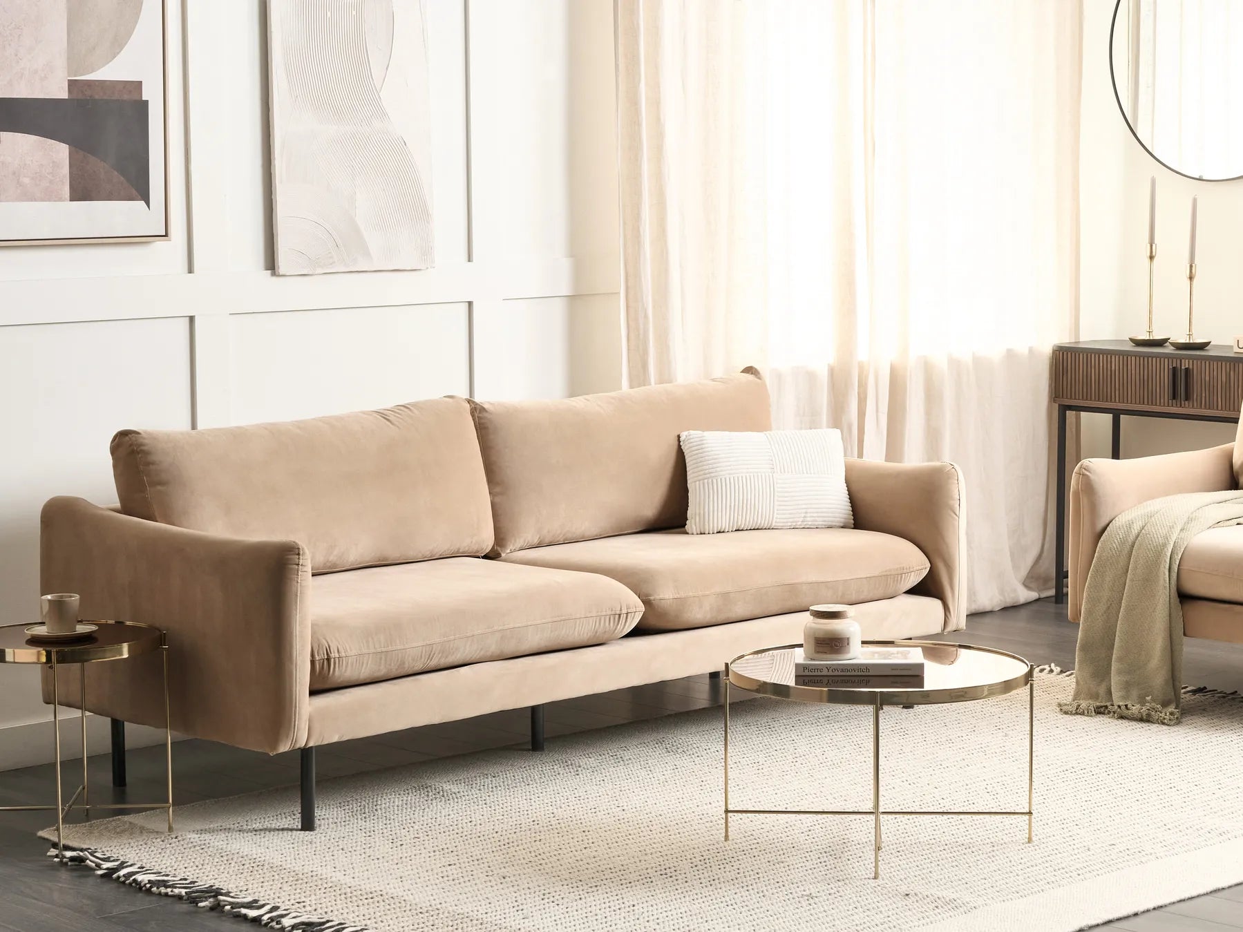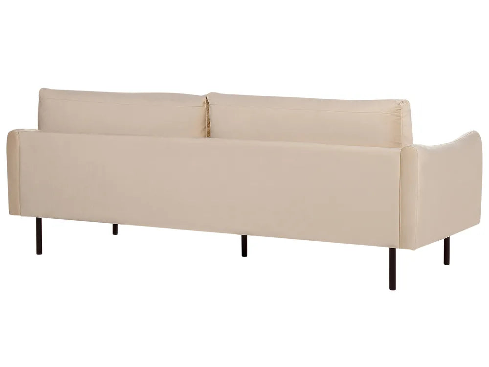 This 3 seater sofa turns any living room into a place of relaxation and leisure. Soft and comfy thanks to the generously padded seat and back cushions, the piece offers enough space to stretch your legs and enjoy a favourite book. The sofa features a durable, wooden construction and metal legs which provide stability, while the soft velvet upholstery gives it an elegant look thanks to its distinctive sheen. Whether in modern, traditional, or industrial setting, the 3 seater becomes a highlight of any interior in an instant.