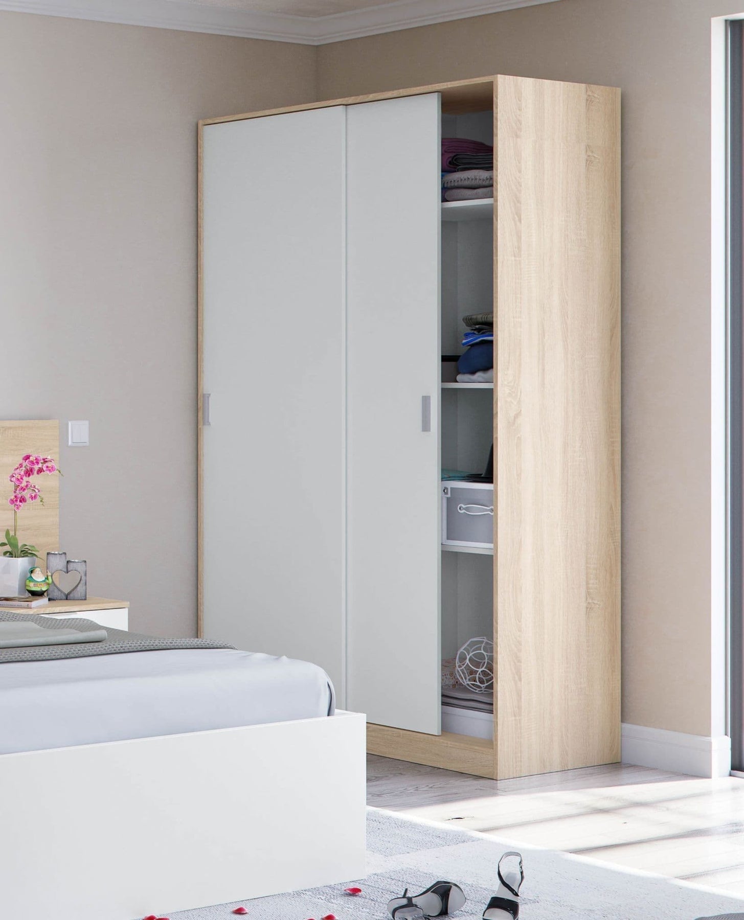 The natural oak-effect frame paired with clean white panels creates a balanced contrast, bringing warmth and sophistication to contemporary interiors. Its minimalist lines and discreet handles enhance the sleek aesthetic, while the durable construction ensures long-lasting reliability. Designed for practicality and modern style, the Arvil wardrobe is an ideal choice for those seeking efficient storage with a refined touch.