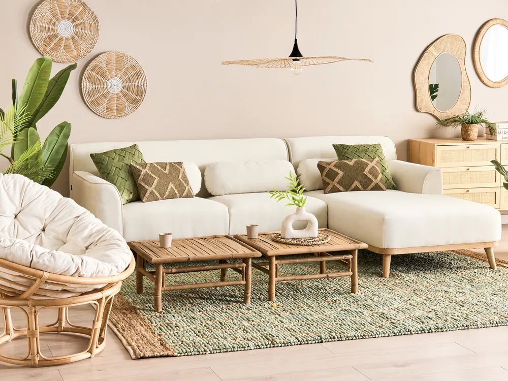 Indulge yourself with this 3-seater corner sofa. Enveloped in the lush embrace of fabric upholstery, you will notice how it's extremely pleasant to the touch. The decorative wooden base and legs add a touch of charm, blending seamlessly with any interior. Generously accessorised with extra cushions, this sofa is an invitation to unwind in style.