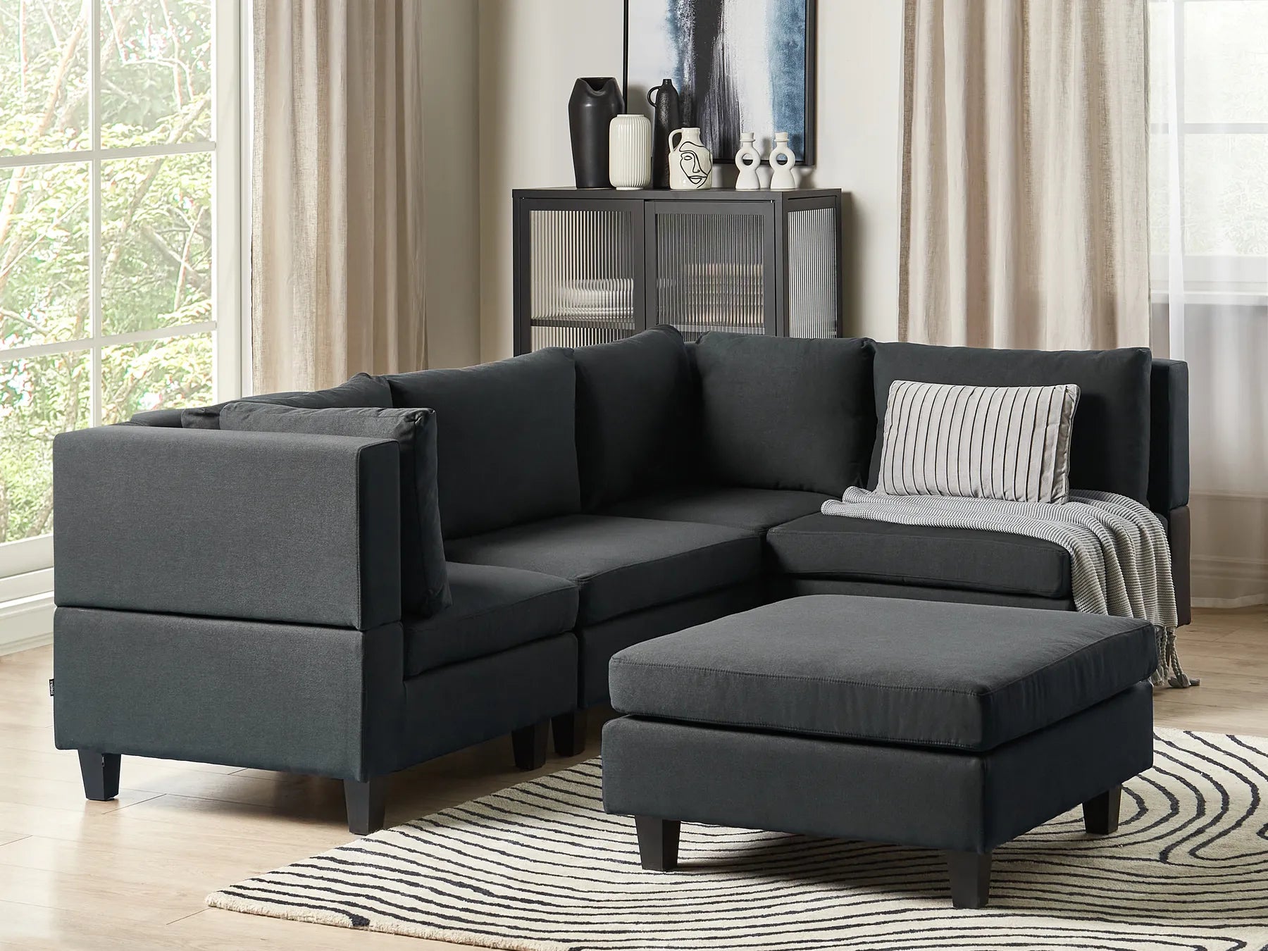 The furniture designed to suit your home, this sofa comes with four modular pieces that can be easily arranged into a corner. The wide and deep seats grouped together create a large, comfortable space, ideal to stretch out your legs and fully relax. The piece is equipped with synthetic legs in black. Thanks to the polyester upholstery in a neutral colour the sofa perfectly complements a wide variety of decor styles and colour schemes. The set comes with a matching ottoman.